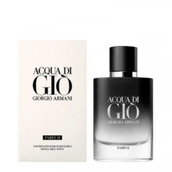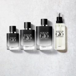 Le flacon d’Acqua di Giò Le Parfum est conçu pour durer, car il est rechargeable. Avec des lignes élégantes qui rappellent la collection, son design présente un dégradé de noir surmonté d’un bouchon noir. Tous les formats sont rechargeables et sont dotés d’un système innovant qui permet au flacon de recharge d’adhérer sans bec verseur, ce qui facilite le versement dans le flacon d’origine sans effort et sans problème.