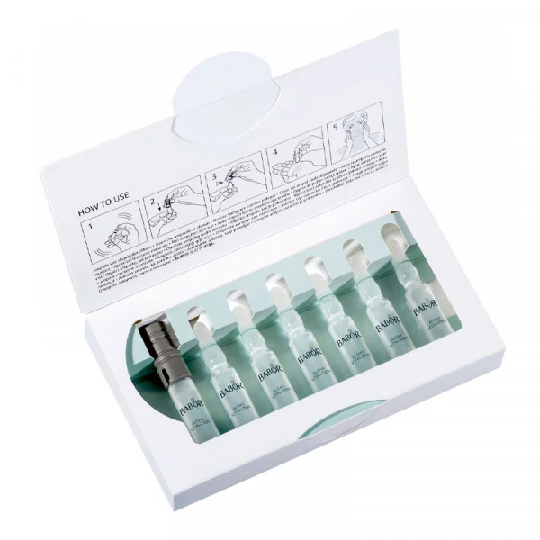 Après nettoyage avec les produits BABOR CLEANSING. Secouez l’ampoule et couvrez le col de l’ampoule avec un mouchoir ou l’ouvre-ampoule fourni. Tenez l’ampoule par le col de l’ampoule ou l’ouvre-bouteille et brisez l’anneau blanc inférieur d’un mouvement brusque. Mettez le concentré dans le creux de votre main puis appliquez-le sur votre visage, votre cou et votre décolleté. exercer une légère pression sur la peau. Appliquez ensuite la crème de soin.
