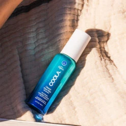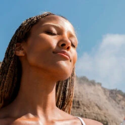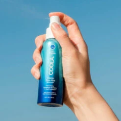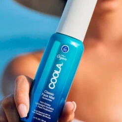 Brume solaire visage bio avec protection SPF 50 transparente et résistante à l’eau pour rafraîchir et protéger.