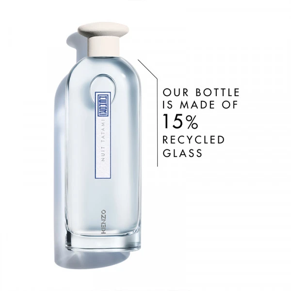Le flacon Kenzo Memori Collection s’inspire d’une bouteille de saké. Contient 15 % de verre recyclé et la boîte est fabriquée à partir de papiers provenant de sources responsables. Transparent et fermé par un bouchon blanc évoquant les pierres des jardins zen, le flacon révèle chaque tonalité pastel des fragrances à travers des lignes pures et raffinées.