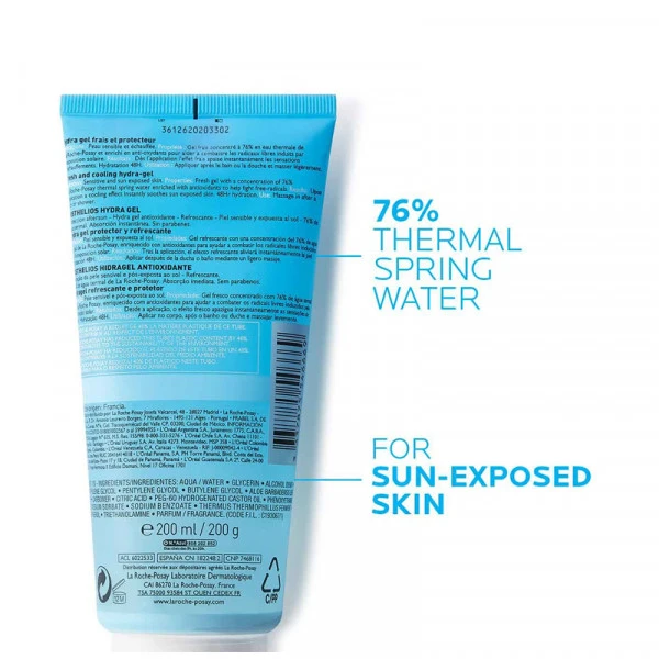 Posthelios Hidra Antioxidant Gel est un soin dermatologique pour le visage et le corps à utiliser après l’exposition au soleil. Il est formulé à base de Venuceane et contient un gel frais très concentré en eau thermale de La Roche-Posay à 76%, ainsi que des antioxydants pour lutter contre les radicaux libres. Sa formule permet d’apaiser et d’hydrater la peau pendant 48 heures, en particulier pour les peaux sensibles exposées au soleil.