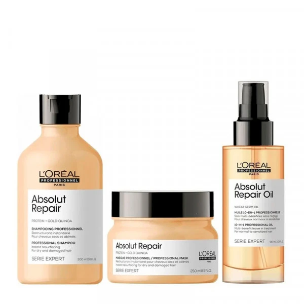 - Absolut Repair Gold Shampoo : Appliquer sur cheveux humides, masser le cuir chevelu jusqu’à mousser et rincer abondamment à l’eau tiède.